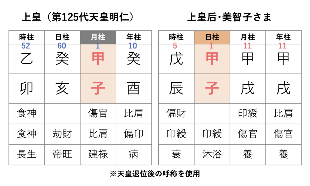 上皇、上皇后の命式を見ると、【甲子】は、上皇后・美智子さま自身の内面性を表す日柱の干支でもあります。