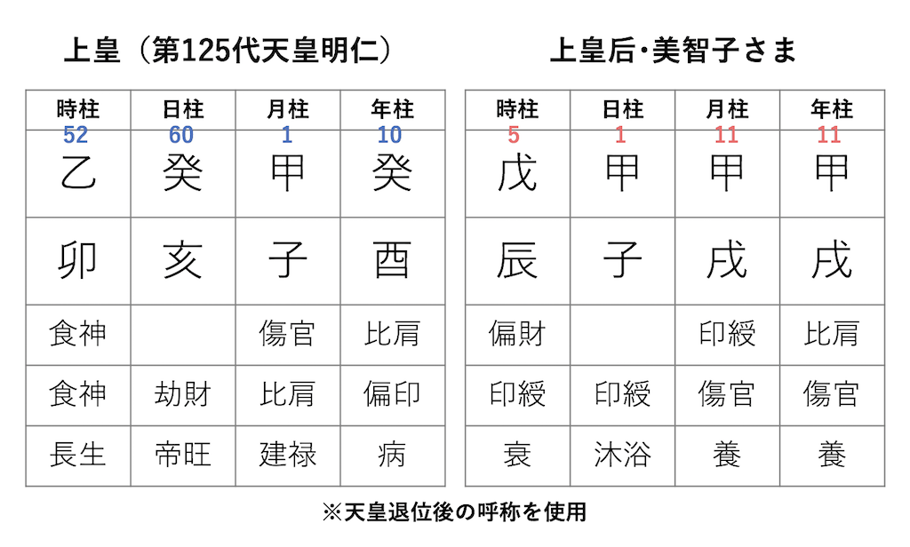 こちらが、上皇(第125代天皇明仁)と上皇后・美智子さまの命式です。