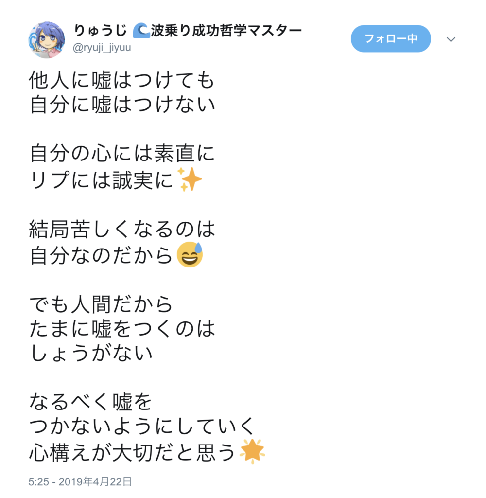 プロフィールの「人生がうまくいかないことを他人や環境のせいにし続けた27年間」の裏側には、りゅうじさんの向上心や理想の高さ、潔癖さがかえってりゅうじさんを追い詰める要因になっていたのかもしれない。