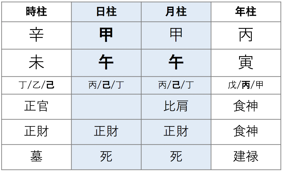 ご覧のように、日柱と月柱の干支がどちらも【甲午】で同じです。