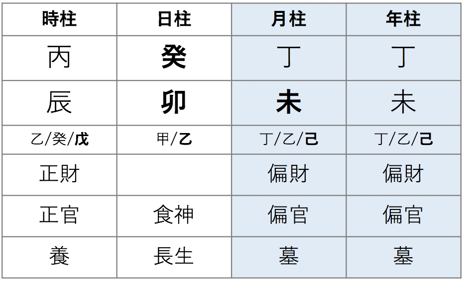 月柱と年柱が「律音(りっちん)」で、命式には【墓】が2つ、第二宿命の十二運星は【死】があります。