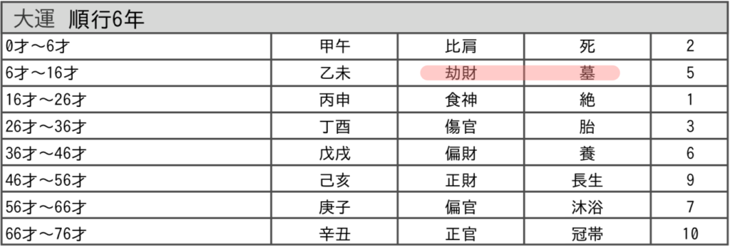 大運表の2段目にある星は、通変星【劫財】と十二運星【墓】の組み合わせ。