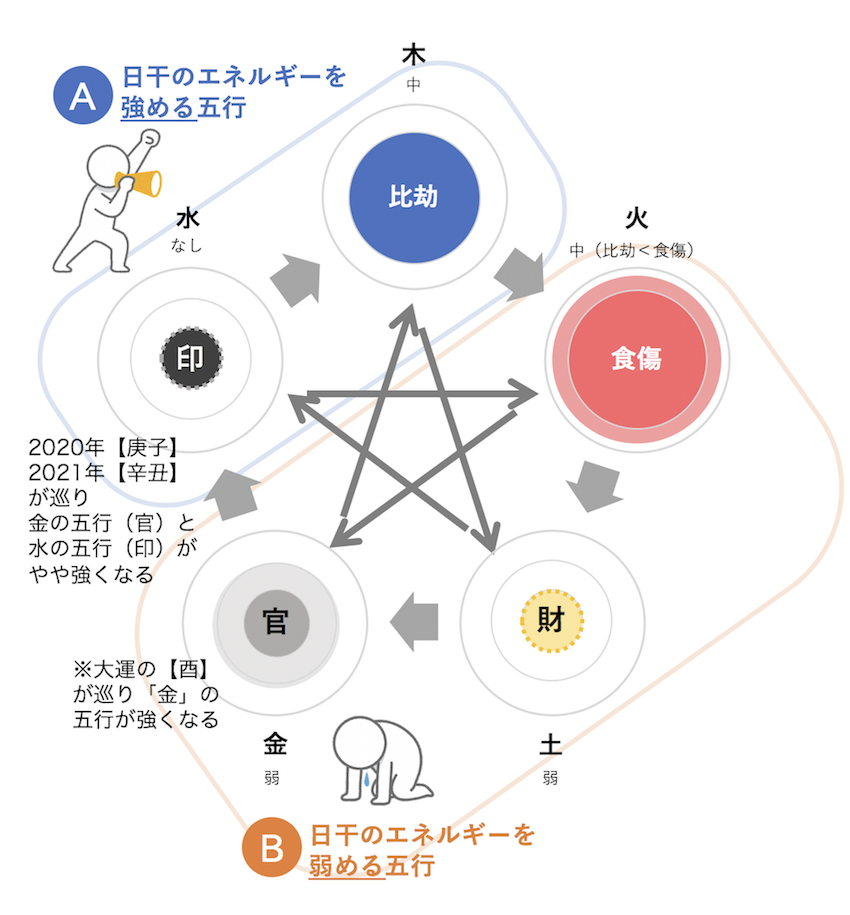 りゅうじさんの五行バランスはもともと【食傷】が強いのが特徴ですが、現在の大運は【食傷】がさらに強くなる時期に。