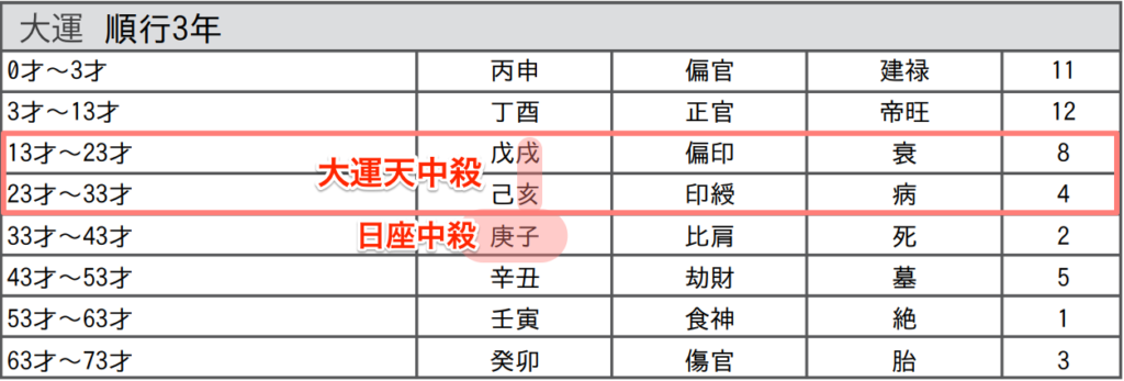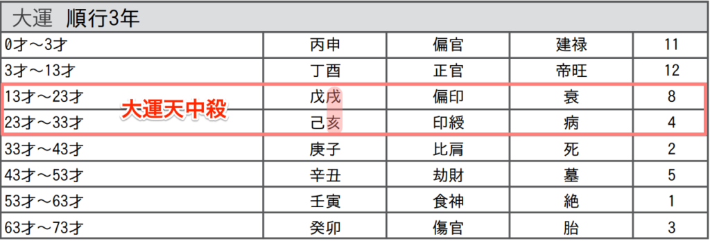 田代さんの天中殺【戌亥(いぬい)】は、13〜23歳の干支【戊戌(つちのえいぬ)】と、23〜33歳の干支【己亥(つちのとい)】の大運に巡っていることがわかります。