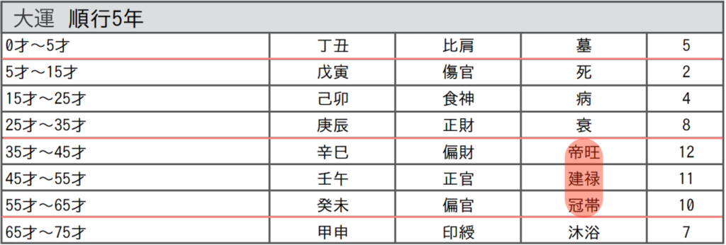 そんなこつっくさんの大運(社会運、キャリア運)は、【偏財 / 帝旺】から【正官 / 建禄】に切り替わります。