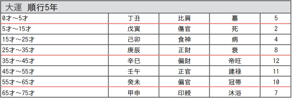 大運は、前半5年は十干の【壬(みずのえ)】で、後半5年は地支/十二支の【午(うま)】で読みます。