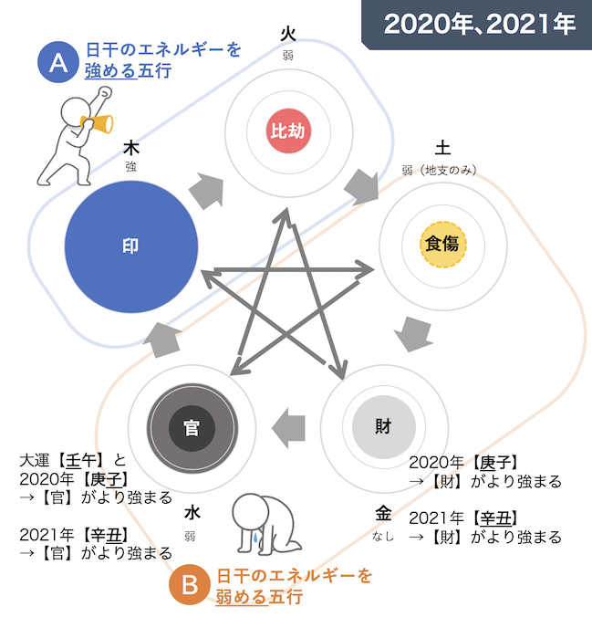 大運干支の天干に【壬】が、2020年(庚子)、2021年(辛丑)の年干支の影響で、こつっくさんの五行バランスが動きます。