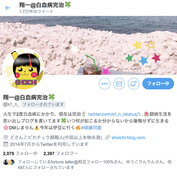 実際、現在の翔一さんは接客業に携わるかたわら、ブログやTwitterで「白血病と闘った日々」をテーマに、同じ病気で苦しむ人々に一経験者として積んできたことをわかりやすく伝え、励ます活動を続けています。