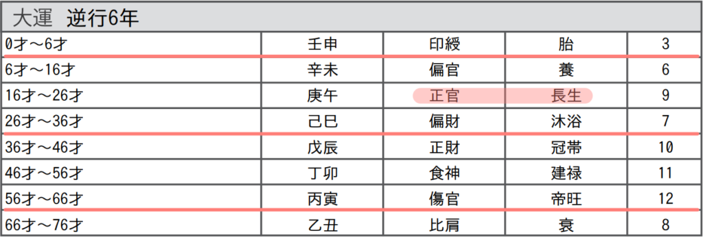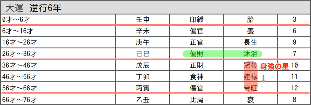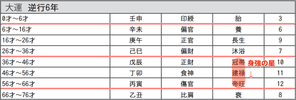 二つは、36歳から始まる30年間を巡る十二運星が【冠帯 / 建禄 / 帝旺】という〝身強の星〟であること。