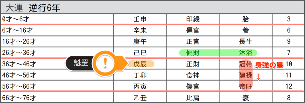 一つは、36歳〜46歳の10年を巡る大運干支【戊辰(つちのえたつ)】は〝魁罡(かいごう)〟であること。