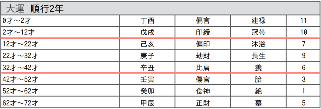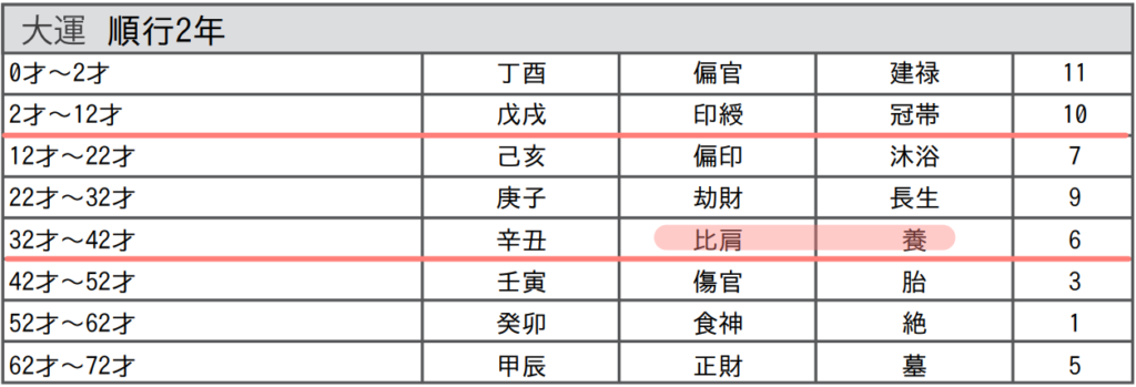 自分の看板を掲げるため、32歳以降の10年の(比肩)の準備を、大運(22〜32歳)の最終年に取り組んでいたこと大運表から読み取れます。