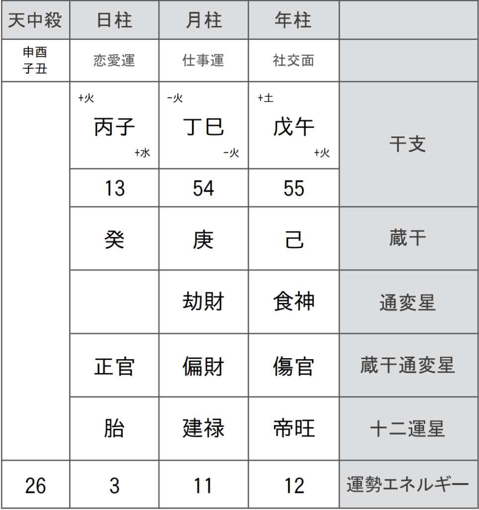 ※出生時間を表す時柱(じちゅう)は含まれていません。ただし、時柱は把握しているため五行バランスにもとづいて読み進めています