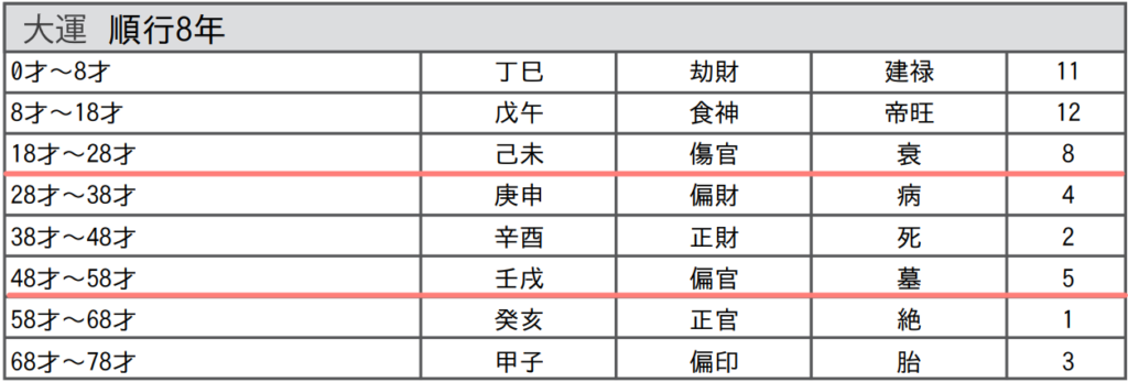 28歳〜58歳までの30年間は、社交的でたくさんの人を束ね(偏財 / 正財)、行動力旺盛な運気(偏官)が巡ります。