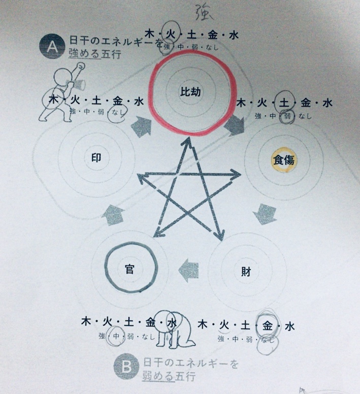 ひと目でわかるように、たーくんの五行バランスは、たーくん自身を表す【比劫】が非常に強いのが特長です。