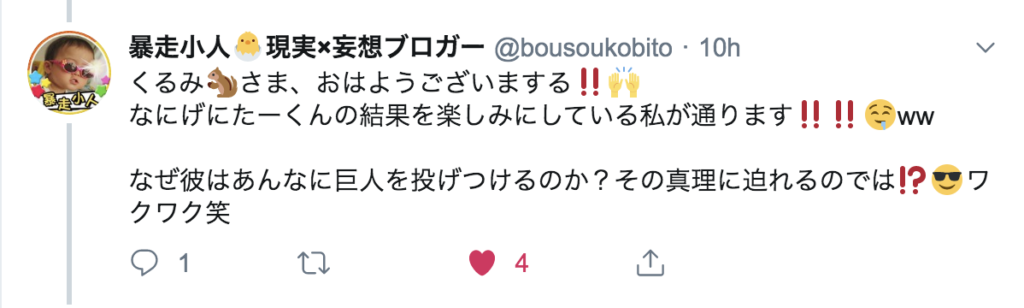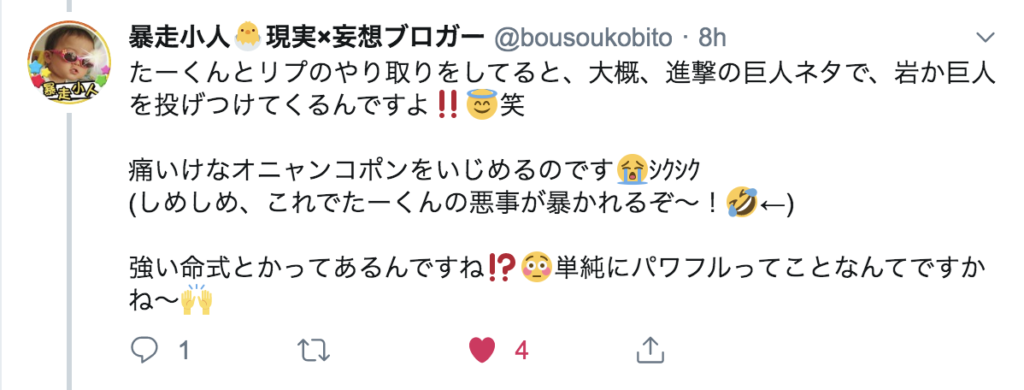 今朝の挨拶ツイートで「たーくんのザツ鑑定の記事を書き上げる…」と発信したところ、暴走小人さんからこんなリプをもらいました。