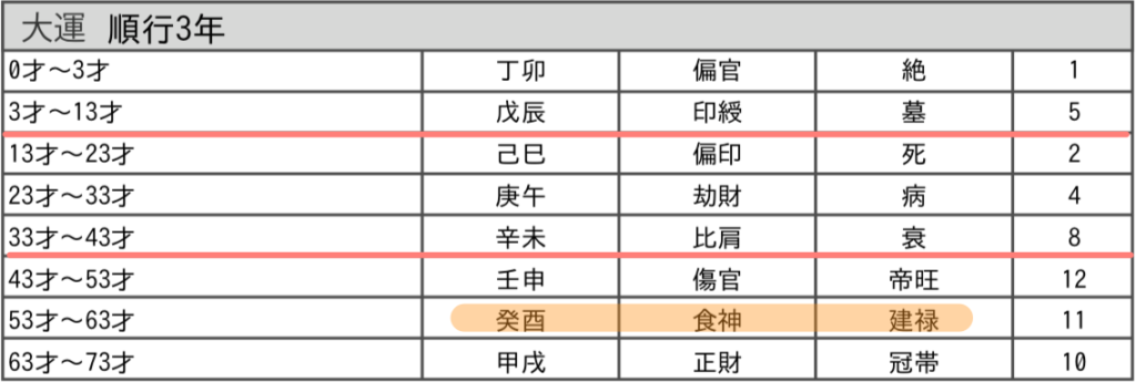43歳〜73歳までの30年間は、身強の星が巡って超絶パワフルな運勢です。