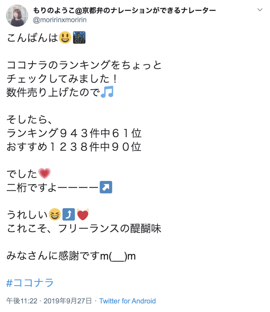 ようこさんのTwitterアカウントには「京都弁のナレーションができるナレーター」というフレーズが付いています。