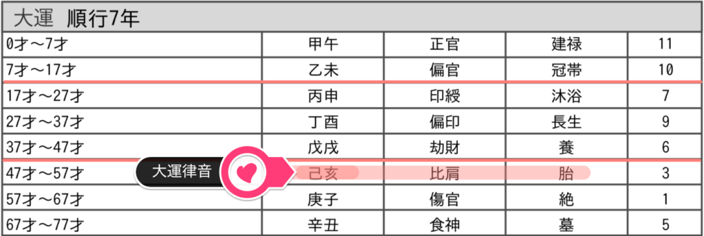 大運律音とは、とっつさん自身を表す日柱の干支【己亥(つちのとい)】が、47歳〜57歳のとっつさんの大運に、同じ干支が巡る状態のこと。
