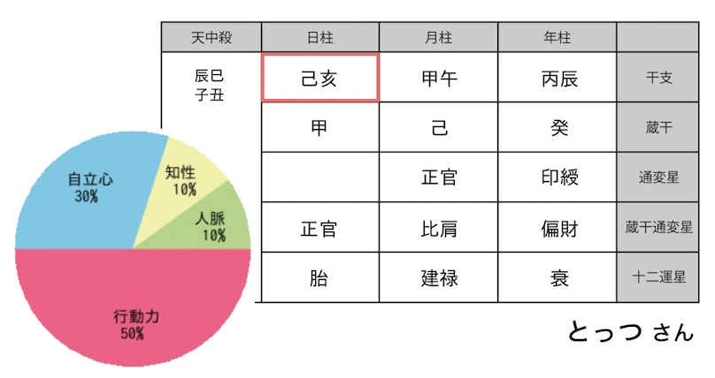 理由は、とっつさんの日柱の干支【己亥(つちのとい)】が、2019年の干支と同じであることから。