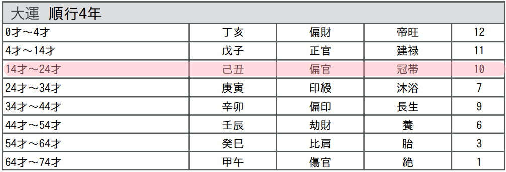 社会からの期待役割を意味する第二宿命(大運の2段目)に、運気【偏官+冠帯】が巡っています。