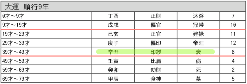 運勢のピークは過ぎ、39歳以降は十二運星【衰】がめぐります。