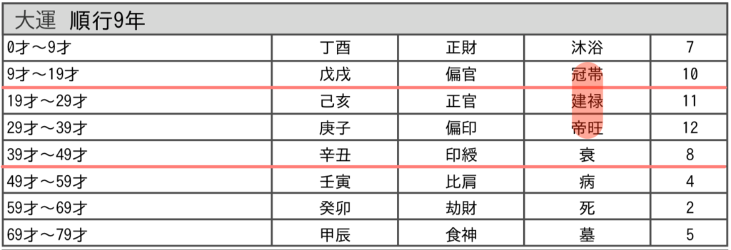 9歳〜39歳までの30年間は、身強の星が巡って超絶パワフルな運勢です。