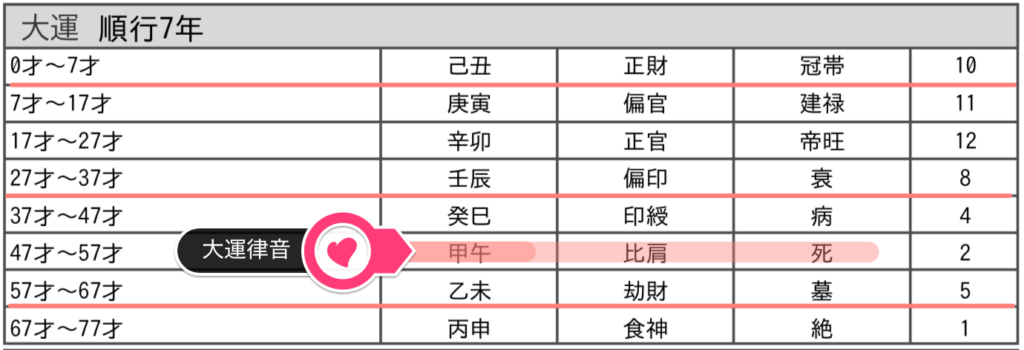 大運律音とは、まさとさん自身を表す日柱の干支【甲午(きのえうま)】が、47歳〜57歳のまさとさんの大運に、同じ干支が巡る状態のこと。