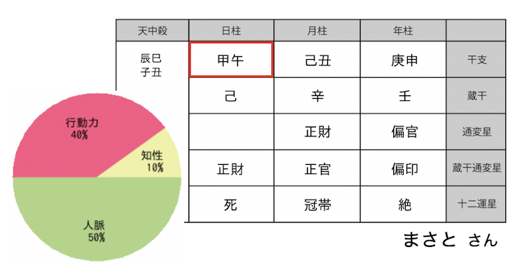 だから、命式の月柱と日柱にある【正財(誠実で親切で堅実な星)】や、まさとさんのオフィシャルな面を示す【正官(秩序、責任感、信用の星)】があることがわかり、ガッテンでした。