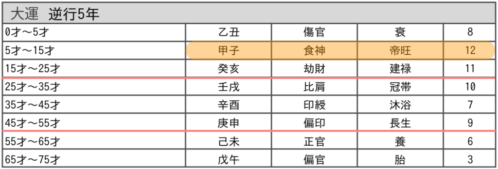15歳〜25歳は、五行バランス上、人生最大級の「大洪水」に見舞われた10年間であることがわかります。