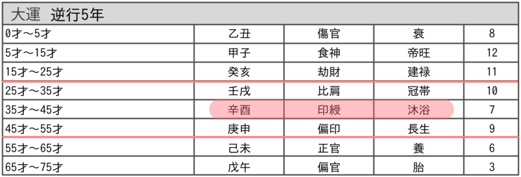 35歳〜45歳の大運は【印綬 / 沐浴】。