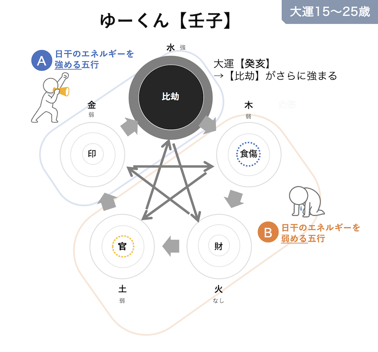 大運干支【癸亥(みずのとい)】は、天干、地支ともに「水」の五行であるため、ゆーくんの五行バランスの【比劫】の円は、さらに大きくなります。