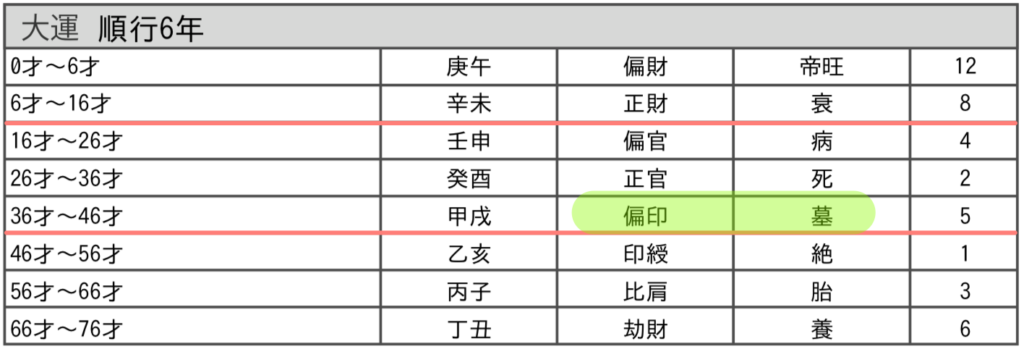 36歳〜46歳の10年間は【偏印 / 墓】が影響します。