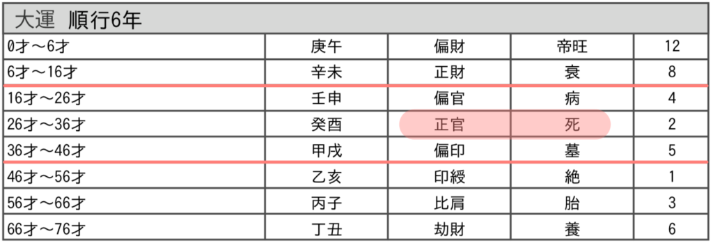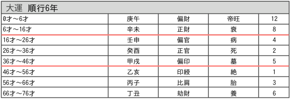 前半5年(26歳〜30歳)よりも、後半5年(31歳〜)の方が過ごしやすくなってきた様子が大運干支でわかります。