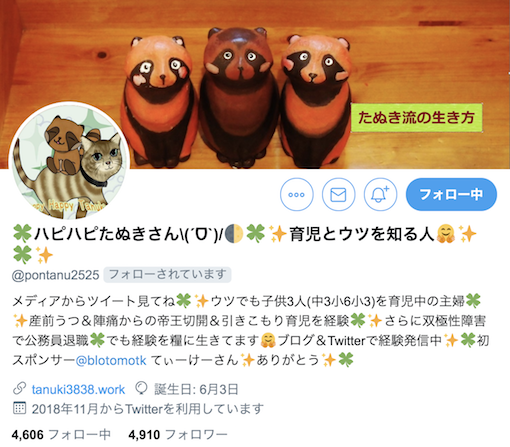 ハピハピたぬきさんといえば、育児とうつを知る人。