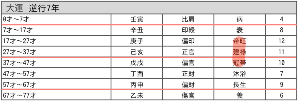 17歳〜47歳までの30年間は、身強の星が巡って超絶パワフルな運勢でした。