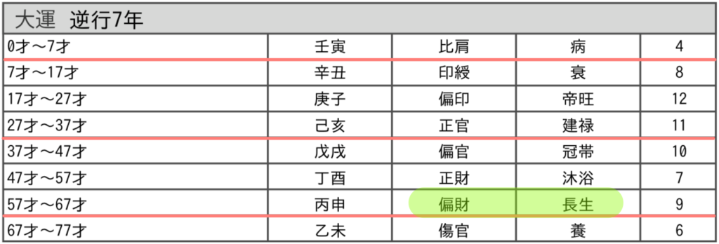 57歳から67歳に影響する星は【偏財 / 長生】。
