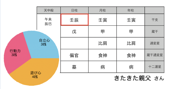 こちらがきたきた親父さんの命式と通変星のパラメーターです。
