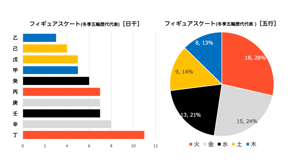 フィギュアスケート選手の日柱の十干でもっとも多かったのは【 丁(ひのと)】でした。