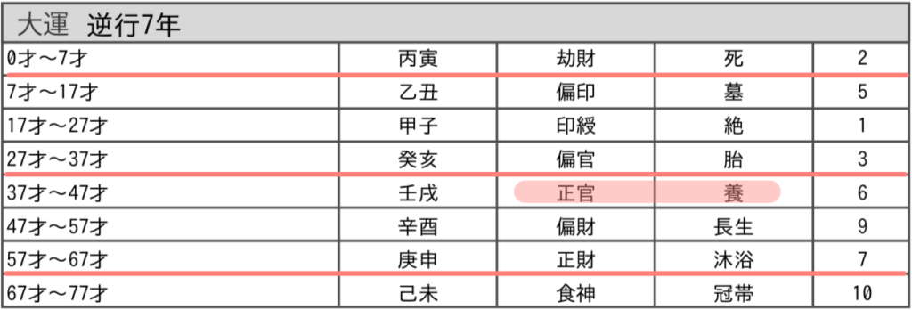 くわえて、37歳〜47歳のれん。さんの大運(社会運)は、十二運星【養】という目上からの引き立て運の星が巡っています。