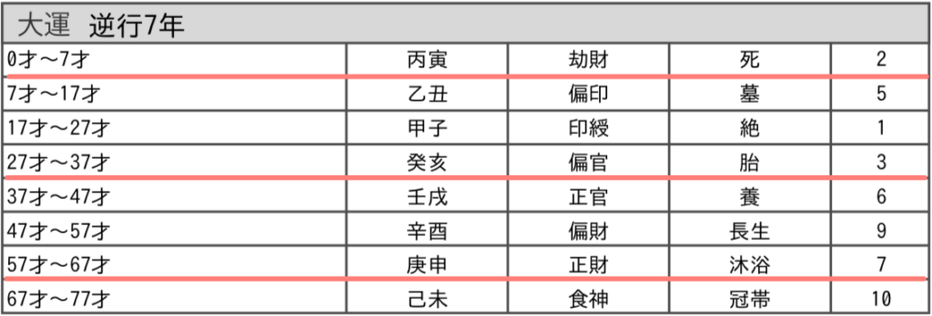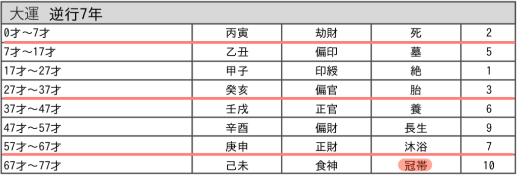 れん。さんの場合、上の大運表では67歳〜77歳に【冠帯(かんたい)が巡ります。