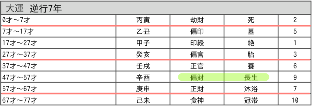 47歳〜57歳の10年間に巡るのは【偏財 / 長生】という星です。