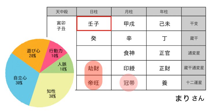 理由は、まりさんが、日柱にある【劫財 / 帝旺】の星をちゃんと活かして自分スタイルを生きている。