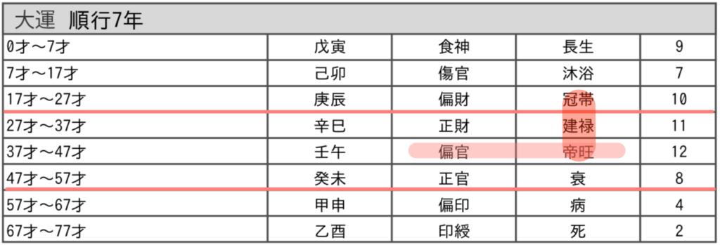 現在のしげさんの大運(社会運、キャリア運)には3つある身強の星で最もパワーの強い【帝旺】が巡っています。