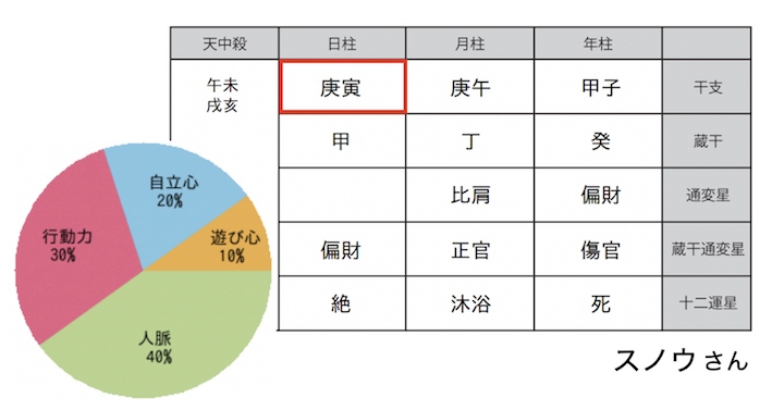 フリーダムでおおらかなスノウさんですが、じつは命式の月柱【正官】は、とっても真面目な星なんです。