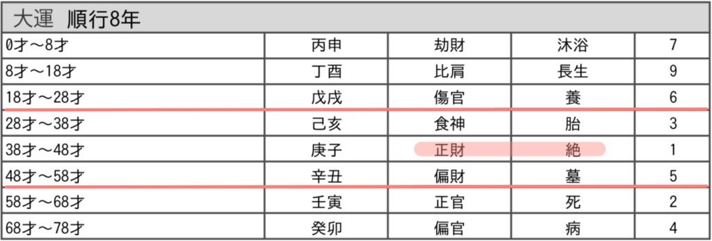 ねこるすさんの大運(社会運)は38歳から切り替わりました。