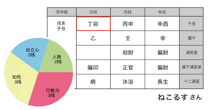 こちらがねこるすさんの命式と通変星のパラメーターです。