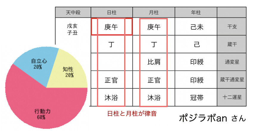 以下のポジラボanさんの命式の赤い枠で囲んだ部分です。
