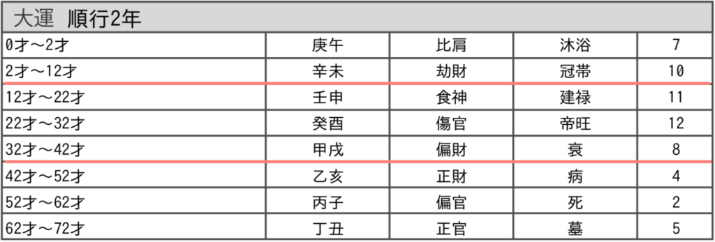 大運は、前半5年は十干の【甲】で、後半5年は地支/十二支の【戊】で読みます。
