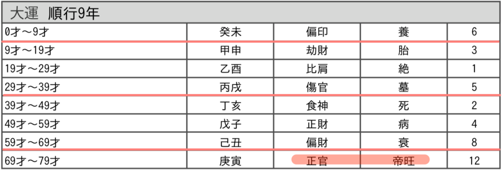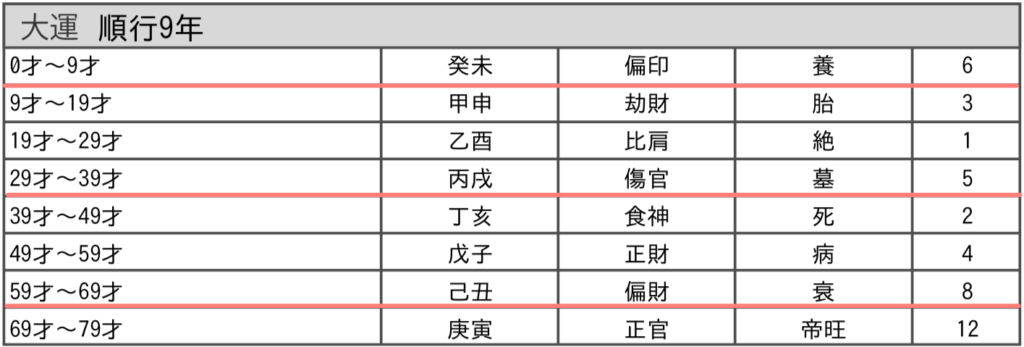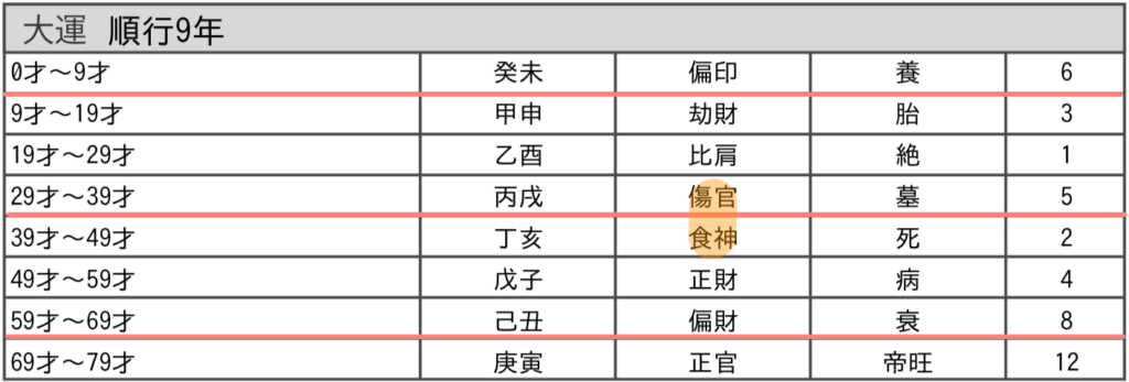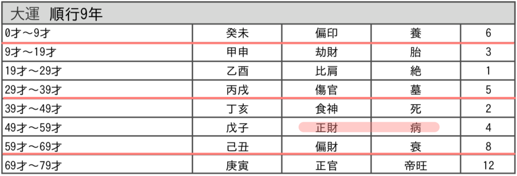 繰り返しになりますが、大運は、前半5年は十干の【戊(つちのえ)】で、後半5年は地支/十二支の【子(ね)】で読みます。