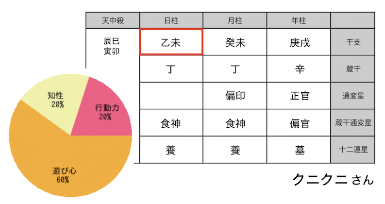 - クニクニさんの命式の特長は、日柱、月柱の蔵干通変星(その人の潜在的な特長を表す星)に【食神】があること